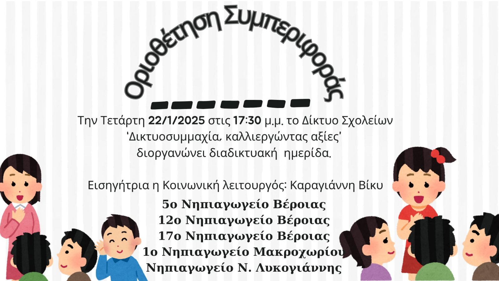 Την Τετάρτη 22 Ιανουαρίου 2025 και ώρα 17:30μ.μ, τα Νηπιαγωγεία του Δικτύου , “Δικτυοσυμμαχία, καλλιεργώντας αξίες”, διοργανώνουν διαδικτυακή ημερίδα για γονείς/κηδεμόνες με θέμα: “Οριοθέτηση Συμπεριφοράς”. […]