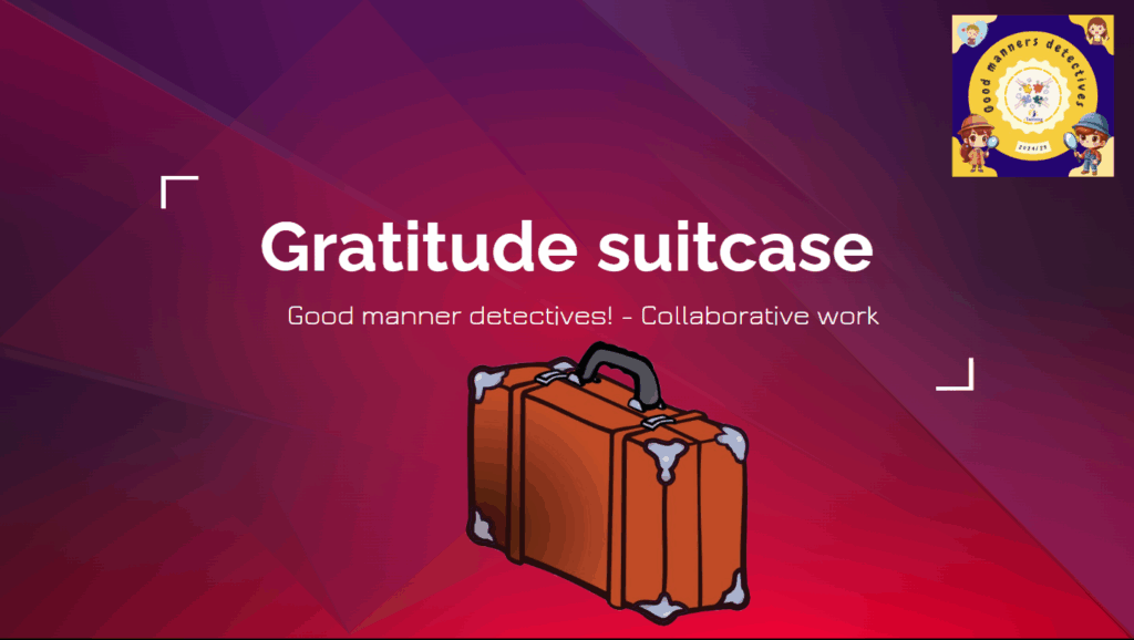 Mε αφορμή την Παγκόσμια Ημέρα Ευγνωμοσύνης τα νηπιαγωγεία του e-twinning προγράμματος “Good manners detectives” δημιουργήσαμε τη “Βαλίτσα της Ευγνωμοσύνης”. Κάθε νηπιαγωγείο έφτιαξε μία αφίσα που απεικόνιζε την ευγνωμοσύνη των παιδιών σε μία αξία!