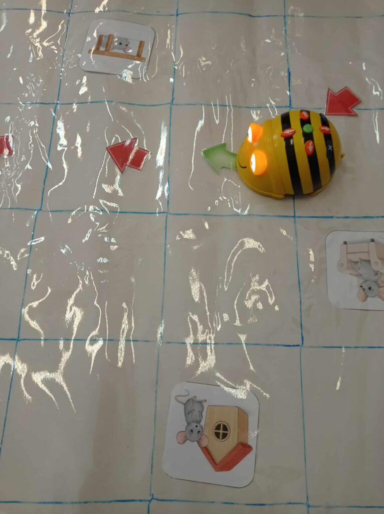 Μαθαίνουμε στο νηπιαγωγείο μας, χωρικές έννοιες: Μέσα-έξω, πάνω- κάτω, πίσω-μπροστά, ανάμεσα…. Ετοιμάσαμε καρτέλες με ένα ποντικάκι και δημιουργήσαμε με αυτές το δάπεδο του Beebot. Τα παιδιά τοποθετούν αρχικά τα βελάκια προκειμένου να πάνε στο ποντικάκι που είναι “μέσα στο κουτί” πάνω στη καρέκλα” ……και στη συνέχεια προγραμματίζουν το Beebot!